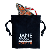 Dr. Jane Goodall is known for her monarch butterfly printed scarf, which she wears to lectures and events. Wear this t-shirt to support the Jane Goodall Hopecast podcast, and to spread hope in your community!
