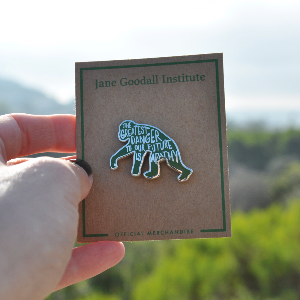 Premium collectible pin featuring Dr. Goodall's quote, "The greatest danger to our future is apathy." Made from recycled metal and features two heavy duty pin posts.