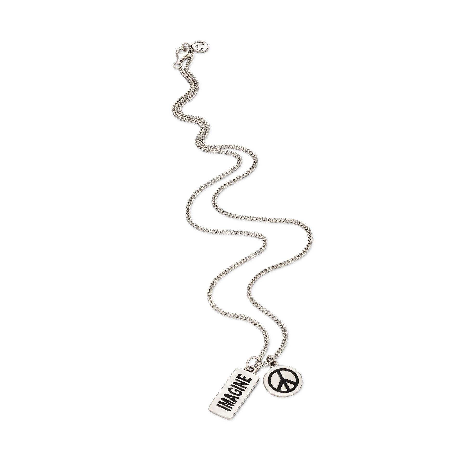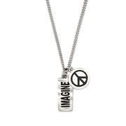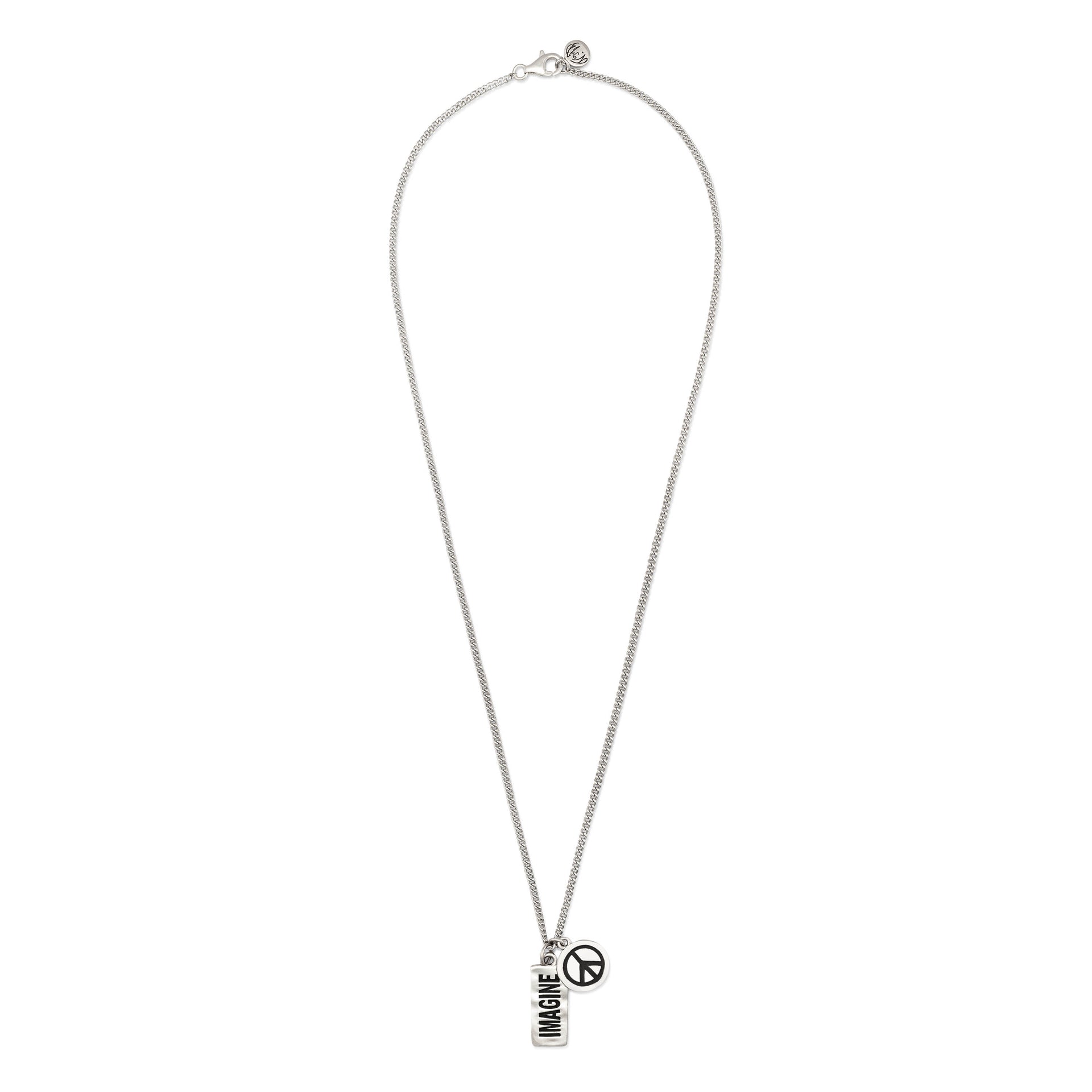 Handcrafted sterling silver unisex necklace featuring John Lennon's iconic IMAGINE PEACE.